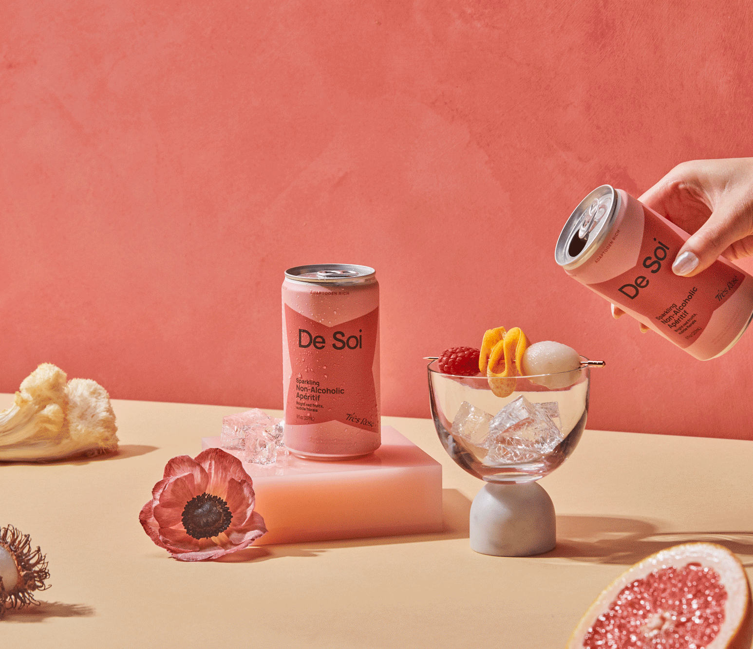 Très Rosé is a bold and balanced sip bursting with notes of tart raspberry and soft, earthy rooibos. Crisp and refreshing, Très Rosé is created with adaptogens, such as lion’s mane and reishi mushroom, that support a mood-boosting buzz without the booze.